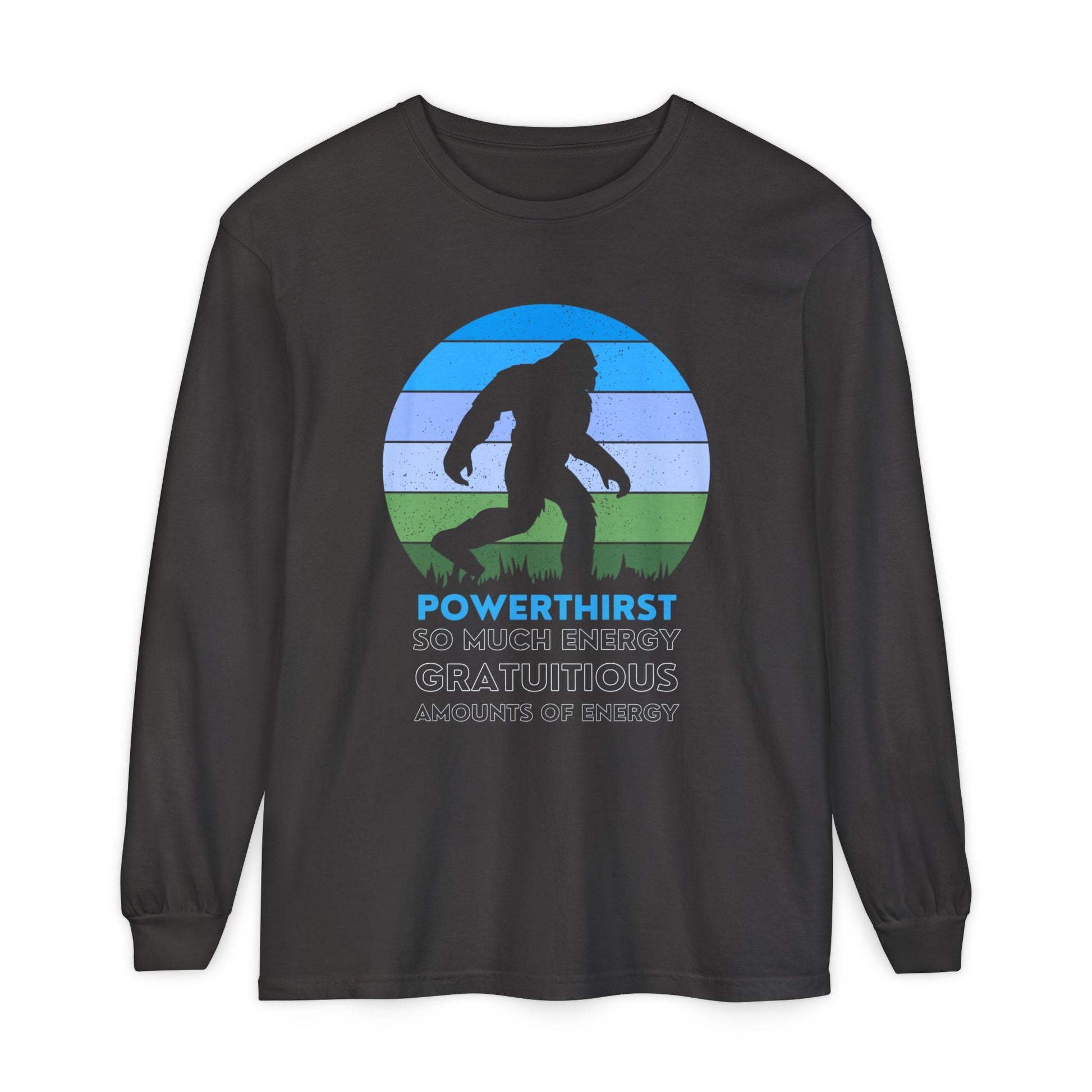 This garment-dyed long sleeve tee brings a warm, lived-in look to outdoor days and quiet evenings. The soft, broken-orange fabric sets off a retro sunset graphic with a large, gentle Sasquatch silhouette standing over pines and a fox — a subtle nod to forest lore and slow weekend hikes. The classic fit and medium-weight ring-spun cotton feel substantial without being stiff. Wear it on cool morning walks, around a campfire, or layered under a flannel for trailside coffee. It settles into your rotation quickly and feels like an old favorite from the first wear.