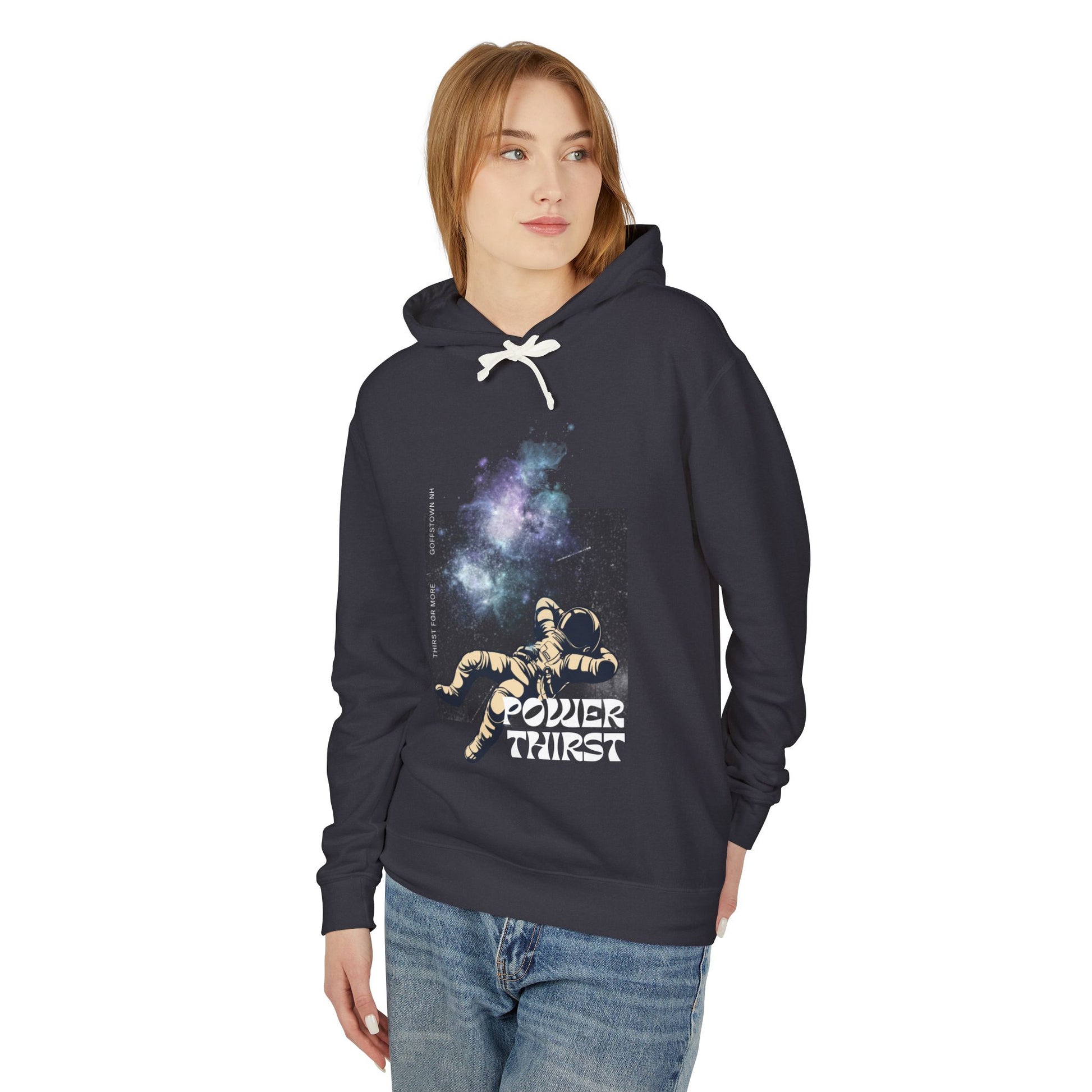 Slip into an easy, lived-in rhythm with this lightweight hooded sweatshirt. Soft ring-spun cotton drapes thinly yet warmly, making the hoodie feel like a quiet companion on cool mornings. The artwork—an astronaut reclining beneath a tapestry of stars with the words “POWER THIRST”—brings a slow, electric wonder to the chest: equal parts vintage sci-fi and late-night dreaming. Rolled-forward shoulders and a relaxed cut let you move without thinking; a jersey-lined hood and natural flatcord add just enough detail to keep it familiar and thoughtful. Wear it on evening walks, at underground shows, or when you need a little cosmic perspective during a long studio session. Its subdued palette blends into streetwear and layered looks, while the sustainable cotton and low-impact dyes make it a quieter choice for people who care about the planet as much as their style.