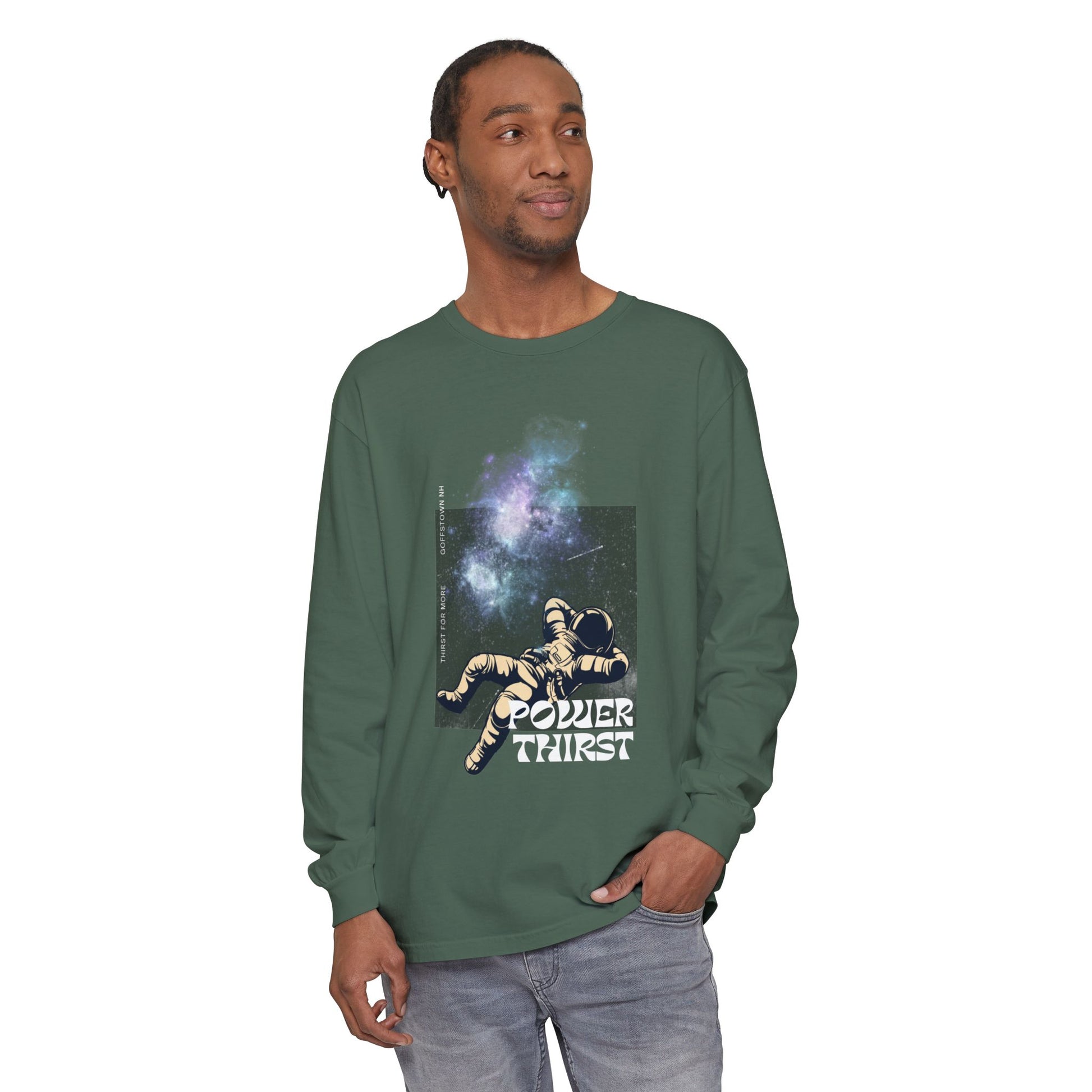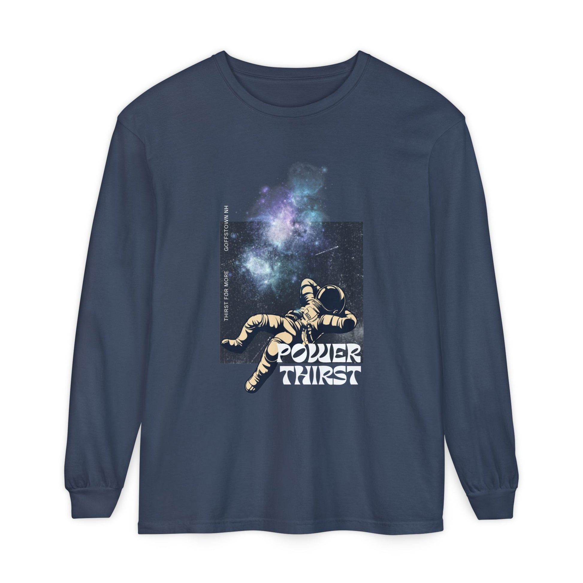 Sink into quiet starlight. This long-sleeve shirt carries a retro-sci-fi print of a relaxed astronaut beneath a drifting nebula and the cheeky caption “POWER THIRST.” The garment-dyed cotton feels lived-in from day one — soft, muted color and a subtle vintage texture that deepens with each wash. Ribbed cuffs hold the sleeves in place while double-stitched hems and neck/shoulder twill tape keep the shirt square and comfortable through countless wears. It reads like a slow-night piece for people who love spacey art, vinyl crackle, and late-night coffee runs. Wear it to nights at the planetarium, low-key shows, or when you’re curled up sketching or reading under a lamp. The relaxed, classic fit lets the print breathe without fuss, and the medium-weight fabric works across seasons.